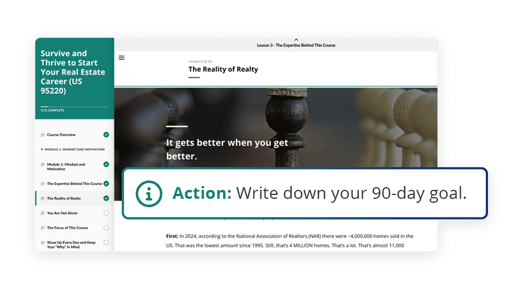 Survive & Thrive is a practice-oriented course designed to help newly licensed agents avoid early setbacks and start gaining traction fast. You’ll learn the strategies, systems, and scripts that top-performing agents used to go from uncertainty to income—without wasting months figuring it out alone.